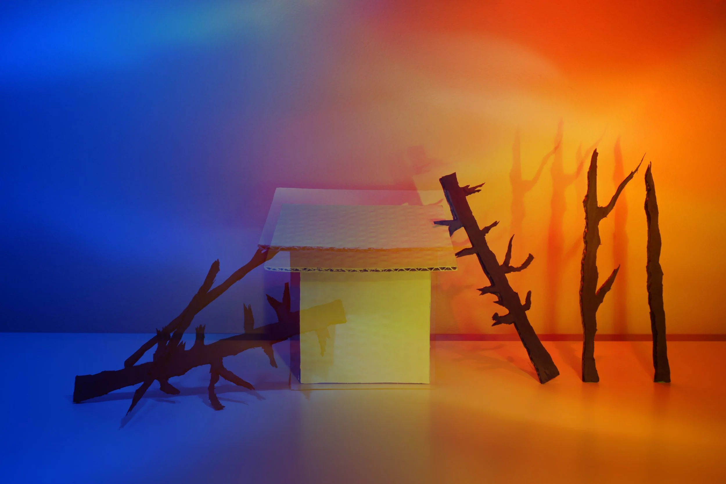 When I was making this work, the direction is making something related to the nature. There was no limit of choice of media and I was at rush so of course I chose photography to safe some time. And then I got the idea of using light to remake the scenario of some nature events. And the Los Angeles wildfire in 2024 inspired me to think if I made a work using light to remake the fire texture how would it be. And also what will happen if flooding and wild fire happen at the same time. So I made this work to show the possible scene and to let people know any of these can happened suddenly, and we should get prepared to avoid these problems as best as we can and escape if needed.